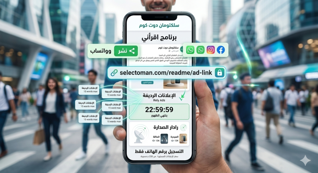تفاصيل برنامج readme للإعلانات المبوبة عبر منصة SelectoMan دوت كوم حيث يعمل هذا النظام المبتكر على تحويل مفهوم الإعلانات التقليدية إلى أخبار تفاعلية سريعة الانتشار عبر الواتساب ومواقع التواصل الاجتماعي من خلال منح كل معلن رابطاً خاصاً يدمج القوة التسويقية للمعلن والموقع والمستلمين في آن واحد لضمان وصول الخبر لأكبر شريحة ممكنة.